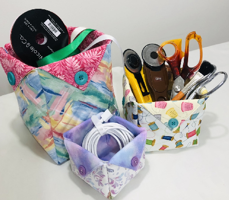 multitude of uses. Use large ones for soft toy boxes or craft supplies. Use in the sewing room to keep scissors, marking pencils and other tools organized or as a thread catcher.